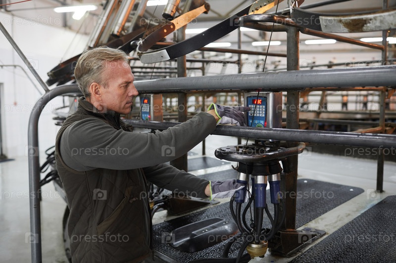 Работник устанавливает доильную машину на молочной ферме