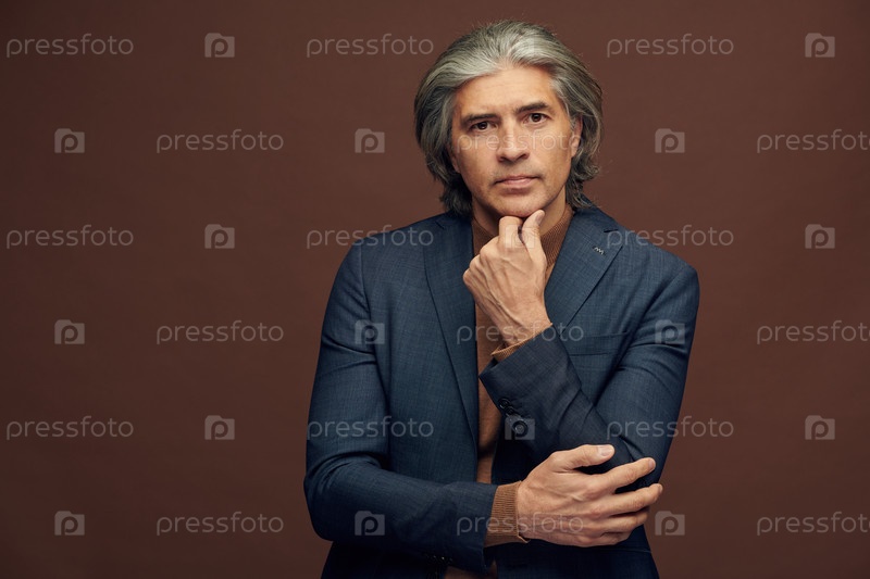 Портрет серьезного любознательного зрелого бизнесмена в стильной куртке, касающегося подбородка, позируя на изолированном фоне