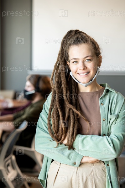 Улыбающаяся молодая бизнесвуменка с дредольками, пересекая руки на груди