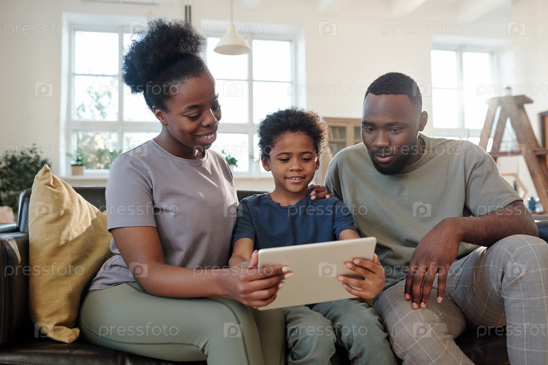 Современная молодая семья отца, матери и сына смотрят онлайн-фильм