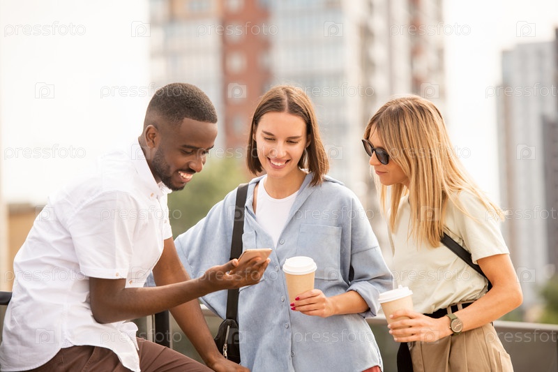 Девушки пьют, глядя на дисплей смартфона у африканского парня