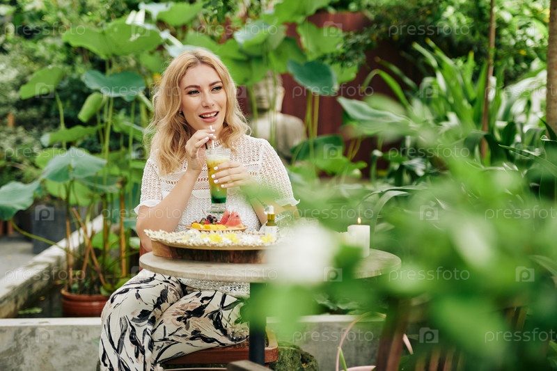 Молодая женщина ест в кафе