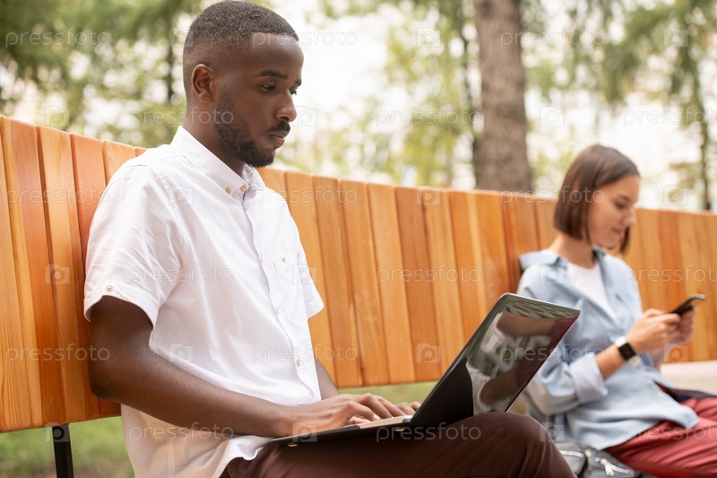 Серьезный парень африканской этнической принадлежности в casualwear сети на скамейке в парке