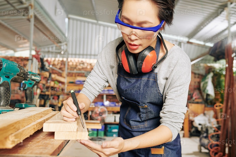 Плотник рисует знаки на деревянной доске