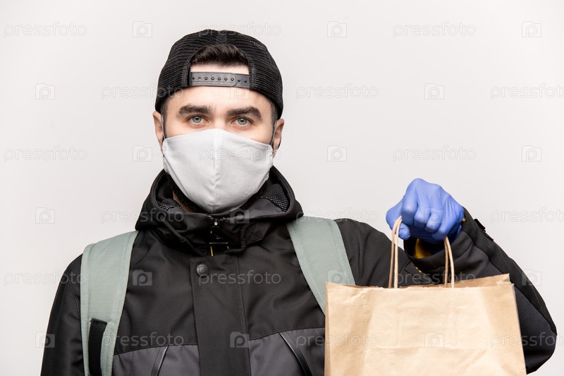 Молодой красивый мужчина в обычной куртке, шляпе, защитной маске и перчатках