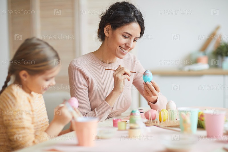 Улыбающаяся молодая женщина рисует пасхальные яйца дома