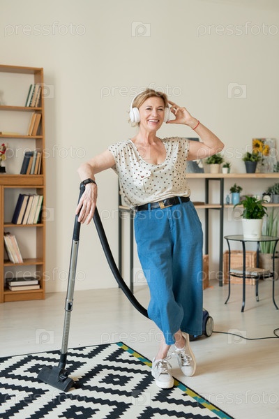 Современная веселая женщина в наушниках и домашней одежде чистит ковер