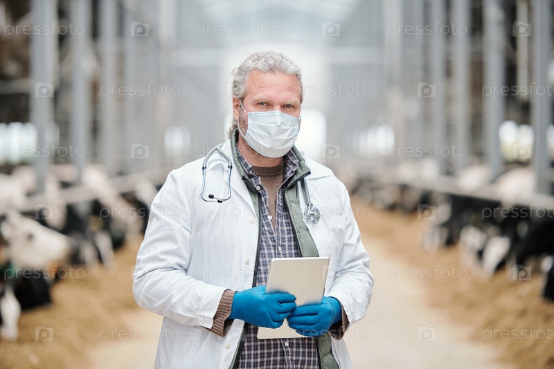 Ветеринар-мужчина в маске проверяет здоровье коров