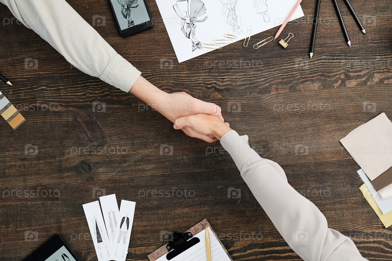 Обзор рукопожатия двух молодых современных модных дизайнеров за столом