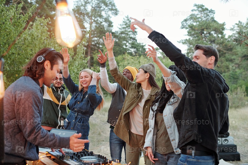 Толпа в восторге молодых межкультурных друзей, поднимающих руки и танцующих