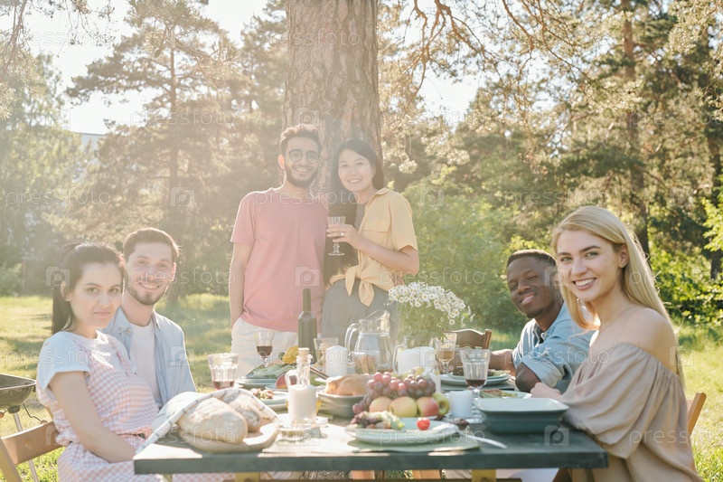 Межкультурные парни и их подруги собрались за обслуживаемым столом, глядя на вас