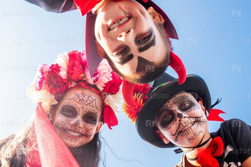 Три счастливых детей Хэллоуина с покрашенными лицами стоят перед камерой