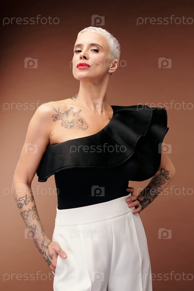 Элегантная женщина в танковом топе и брюках, держащая голову слегка повернутой направо
