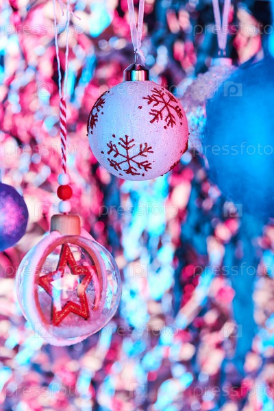 Красивый игрушечный шар с красными снежинками и другими сферическими украшениями для фиртре