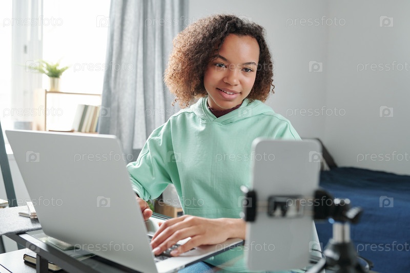 Успешная студентка-подросток в повседневной одежде сидит за столом в спальне и печатает