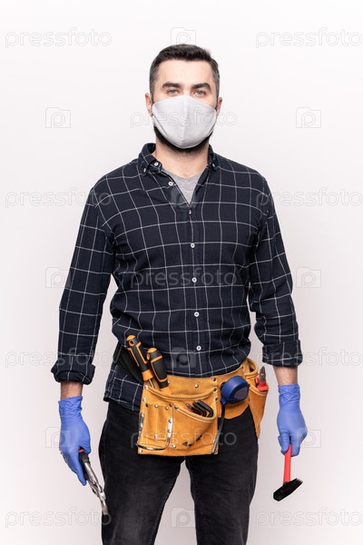 Молодой мастер-ремонтник в повседневной одежде, защитной маске и перчатках держит DIY ручные инструменты