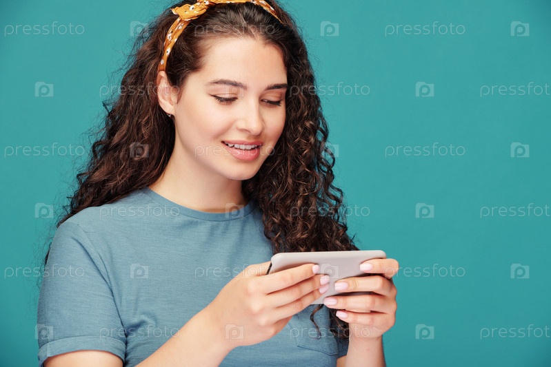 Молодая улыбающаяся женщина с длинными темными волнистыми волосами смотрит онлайн видео