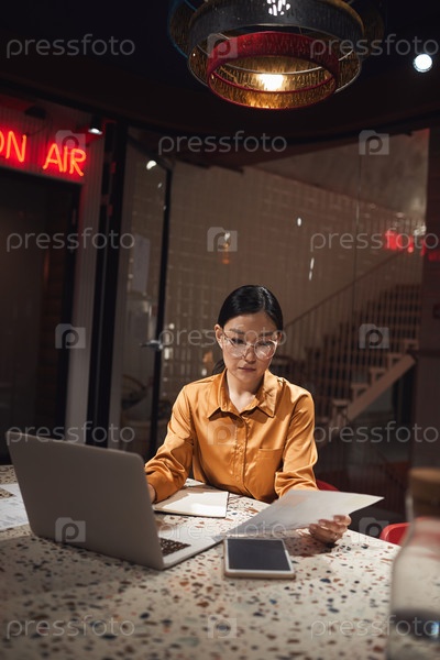 Молодая азиатская женщина использует ноутбук в темном офисе