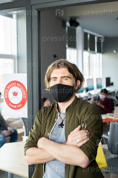 Молодой бизнесмен скрещивает руки на груди, прислонившись к объявлению