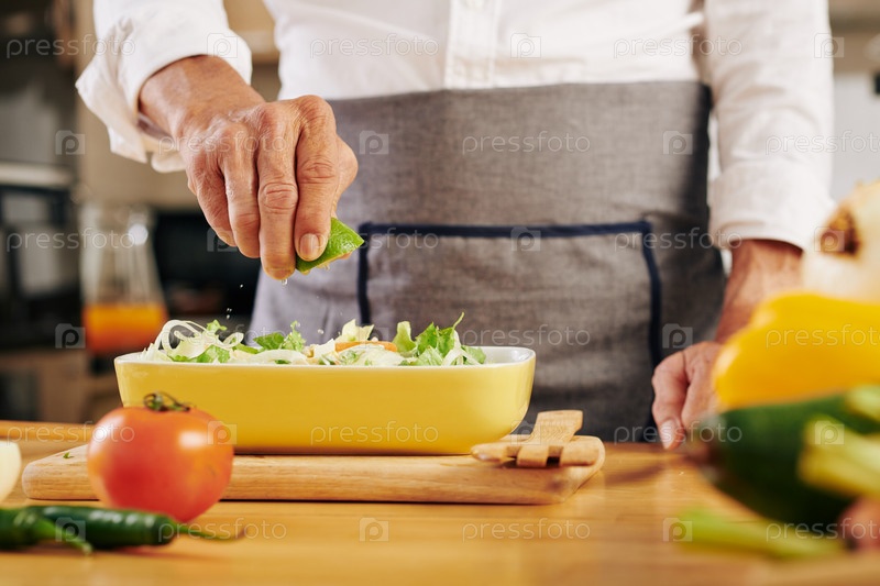 Человек, выжимающий лайм в салат