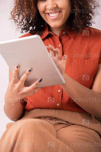 Счастливая молодая женщина с кудрявыми волосами и зубчатой улыбкой, касающейся экрана планшета