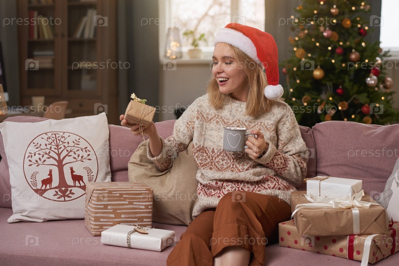 Портрет счастливой молодой женщины в шляпе Санты, сидящей на диване с чашечкой кофе и смотрящей подарковую коробку в руке