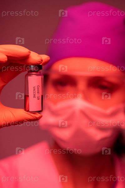 Перчатковая рука женщины-вирусолога или фармацевта, держащей небольшую бутылку с вакциной