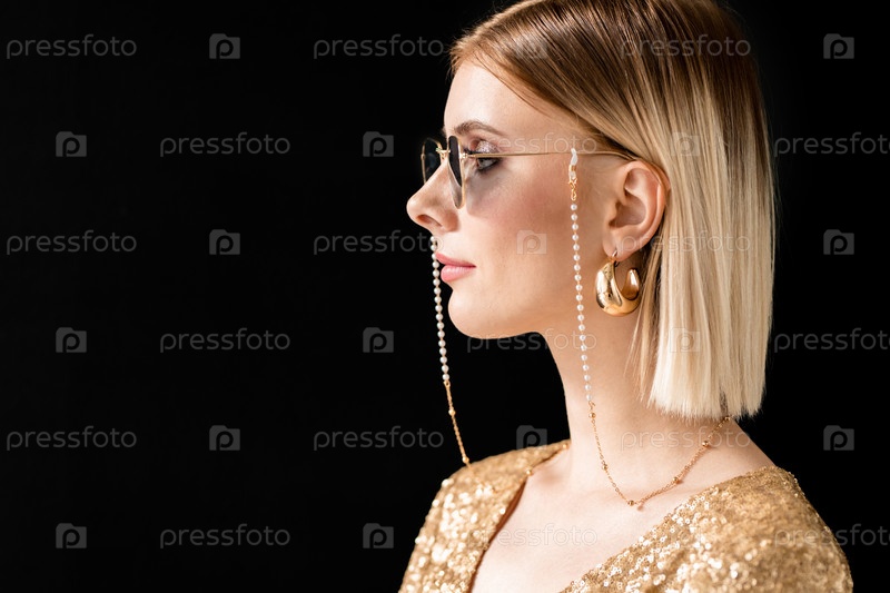 Блондинка-гламурная девушка в стильных солнцезащитных очках, шикарном платье и золотых серьгах