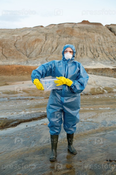 Учёная-женщина в защитных комбинезонах, респираторе, резиновых перчатках и сапогах