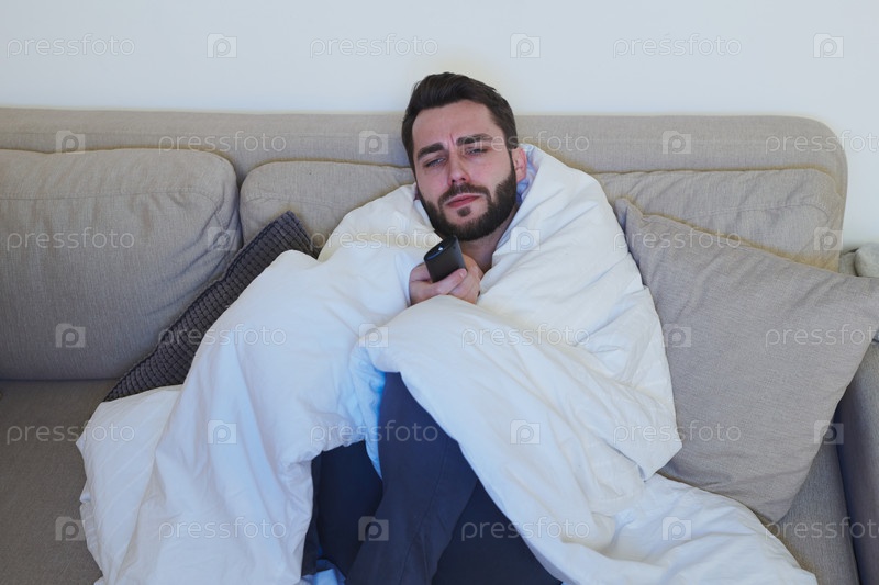 Больной молодой человек с пультом дистанционного управления сидит на диване перед телевизором