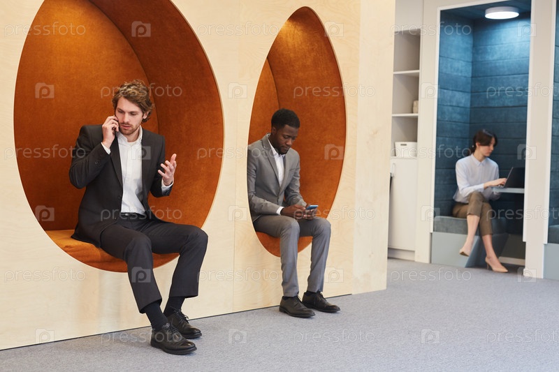 Бизнесмены, работающие в графическом офисном интерьере