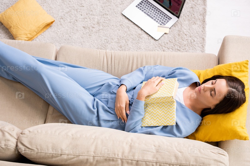 Вид сверху молодой спокойной женщины в синей пижаме, держащей открытую книгу на груди