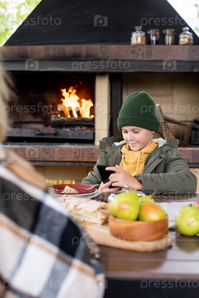 Очаровательный школьник в теплых повседневных одеждах сидит за столом, который подается для ужина на свежем воздухе