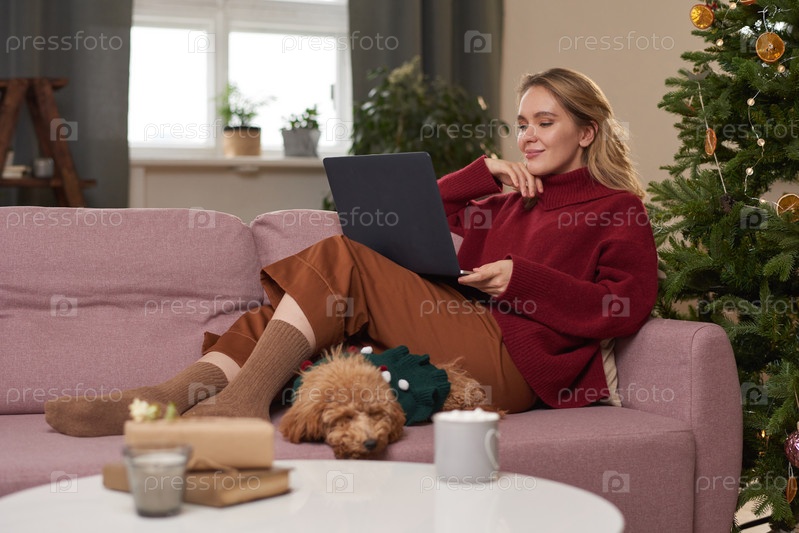 Красивая молодая женщина в тёплой одежде проводит рождественское утро дома, отдыхает на диване со своей собакой в гостиной и смотрит что-то в Интернете