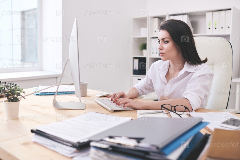 Серьезный молодой офис-менеджер смотрит на экран компьютера, вводя данные