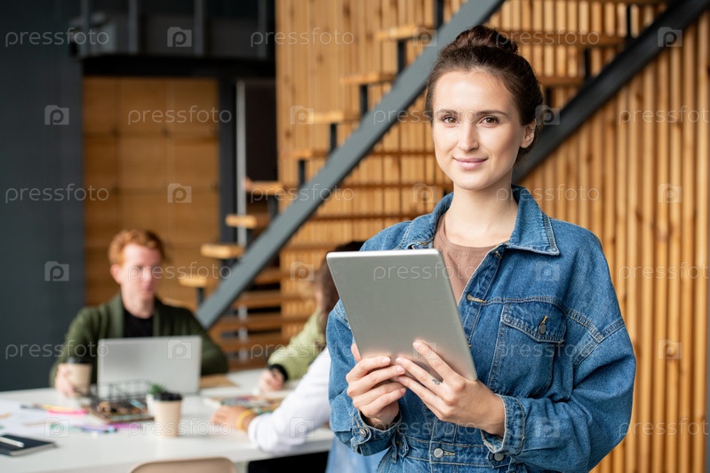 Молодая успешная брюнетка-бизнесменка с цифровым планшетом серфирует в сети