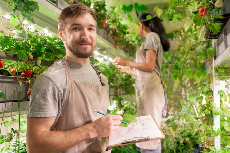 Счастливый молодой мужской селекционер в рабочей одежде, стоящий перед камерой