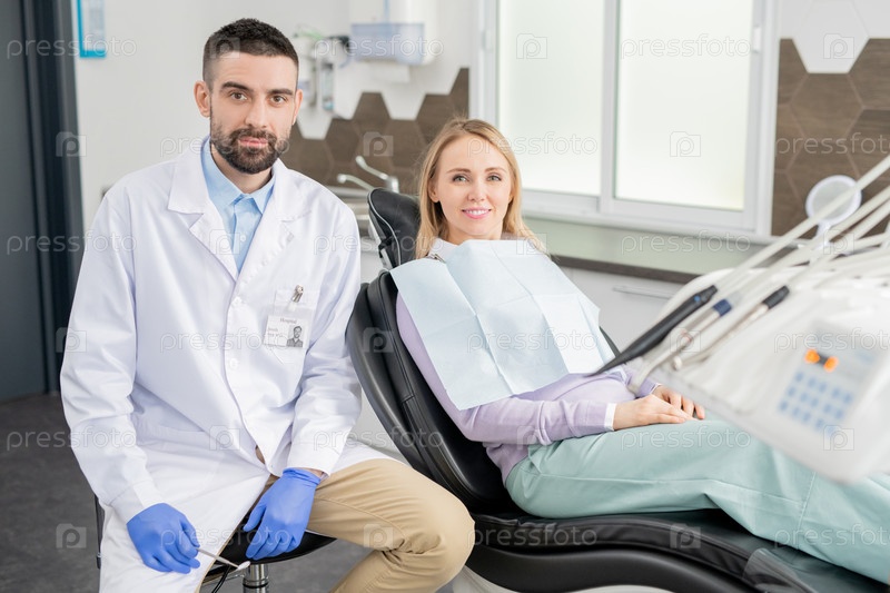 Молодой профессиональный стоматолог в перчатках и белом халате и его блондинка-пациент