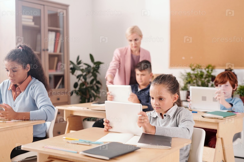 Современная школьница и ее одноклассницы с сенсорными панелями сидят у столов