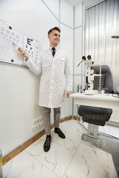 Офтальмолог, указывающий на диаграмму глаз Мужчина