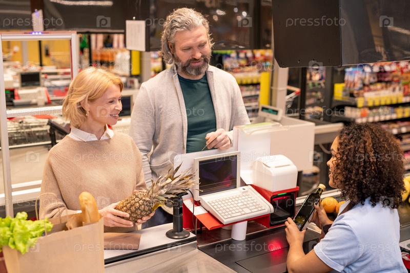 Зрелая пара стоит у кассира, в то время как молодая женщина сканирует продукты питания
