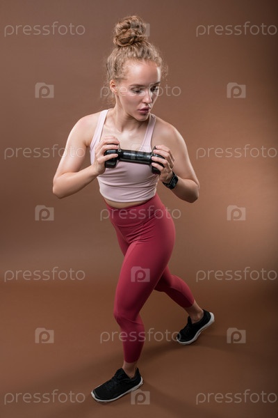 Активная молодая женщина в спортивной одежде, держащая гантели с согнутыми руками в локтях