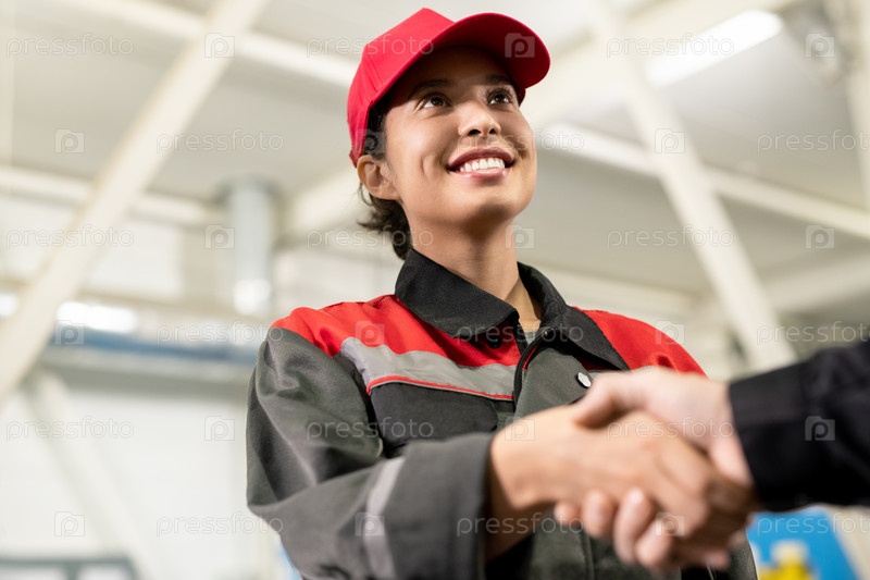 Молодая веселая женщина-инженер в рабочей одежде смотрит на коллегу или бригадира