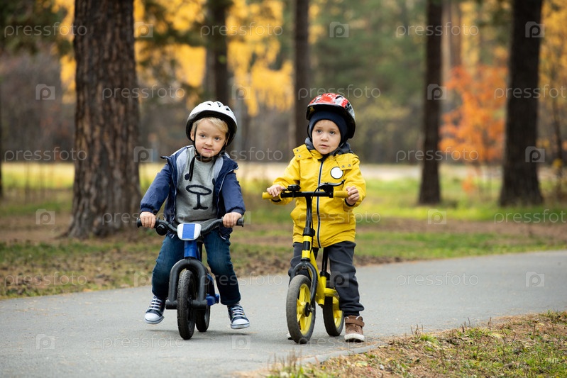 Два дружелюбных мальчика в обычной одежде и защитных шлемах сидят на велосипедах