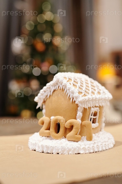 Вкусный домашний дом с имбирным хлебом, стоящий на фоне искрящейся рождественской елки