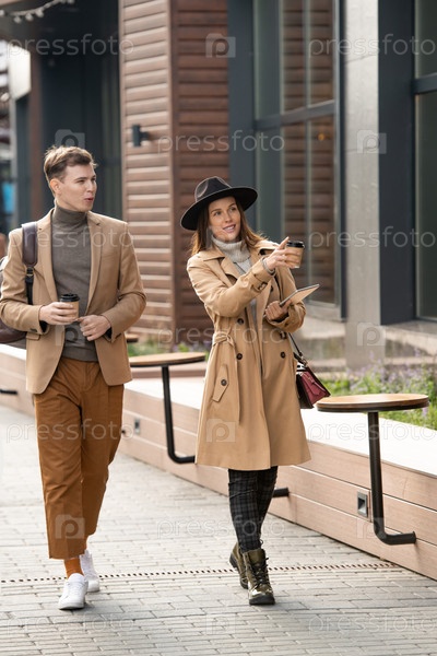 Молодая улыбающаяся женщина с напитком, указывающей вперед во время разговора со своим парнем