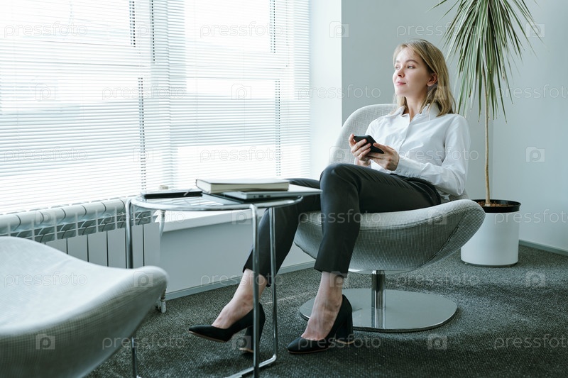 Молодая элегантная бизнесвумен с мобильным телефоном, глядящая в окно