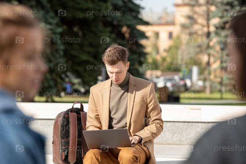Молодой серьезный бизнесмен в умном casualwear сети на скамейке в солнечный день