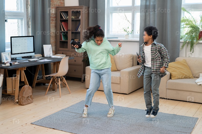 Двое милых братьев и сестер смешанной расы в повседневной одежде, развлекающихся на ковре дома