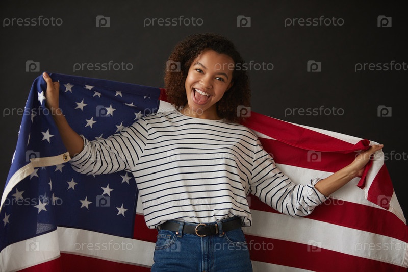 Взволнованная африканская женщина держит американский флаг на черном
